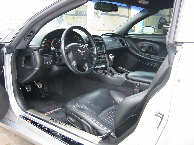Black Leather with Lloyds Z06 floor & trunk mats, Z06 deck lid liner, Glove box decal (silver), Z06 console emblem, C5 stearing wheel decal, C5 Chrome door sills, Z06 SS kick plates, Formula 1 tint.