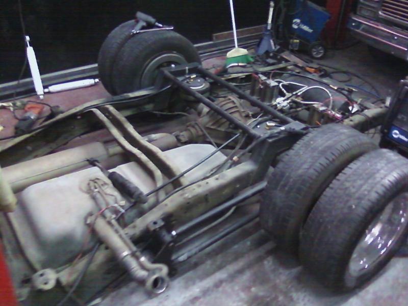 simple back end, parrellel 4 link with pan hard, 4 viairs (only 2 work, going to redo all the air suspensino components when i get the funds)