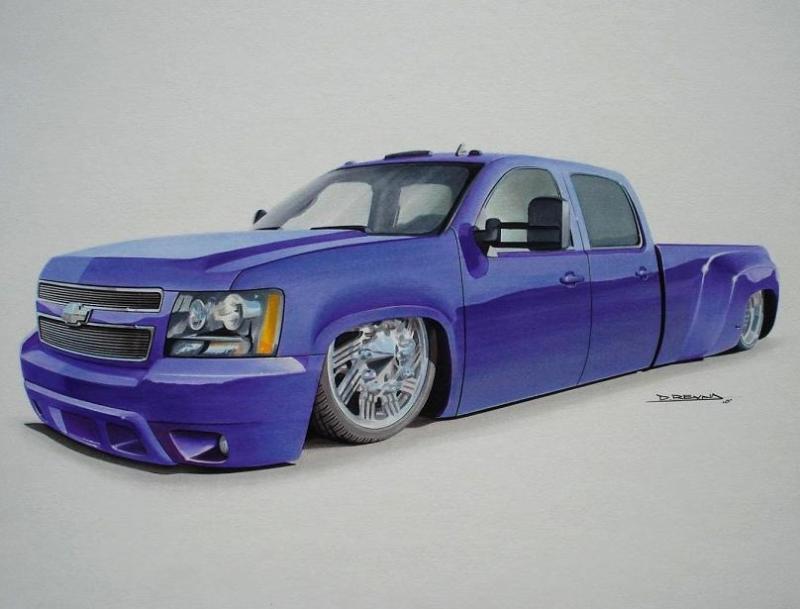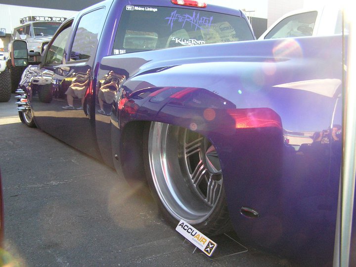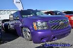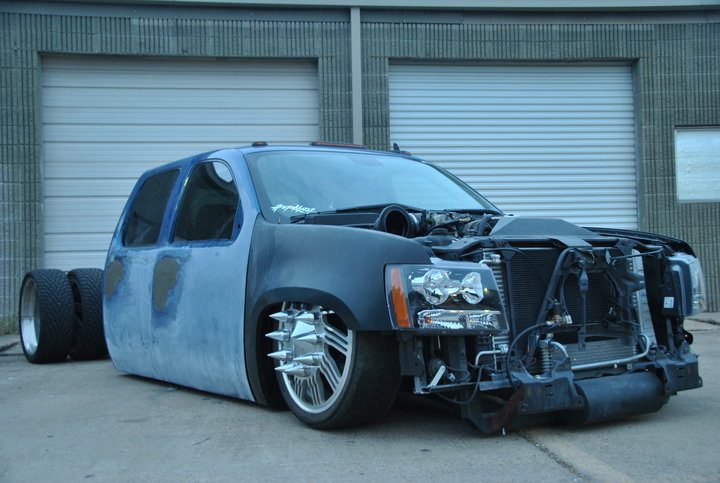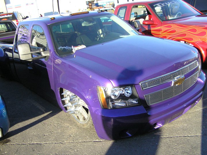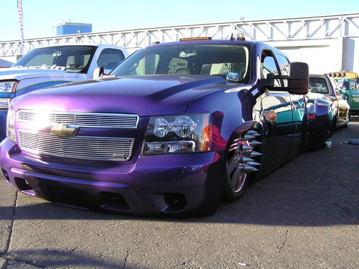 tahoe front end conversion body dropped fully shaved suicide rear doors huge rag top house of kolro pavo purple paint job custom hood 06 chevy hood bubble grafted into tahoe hood