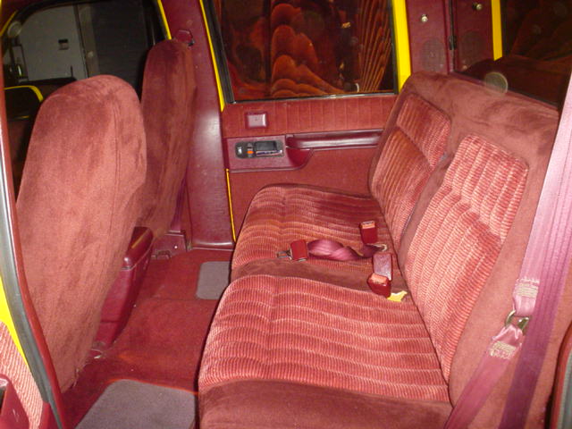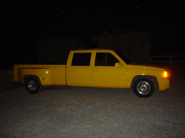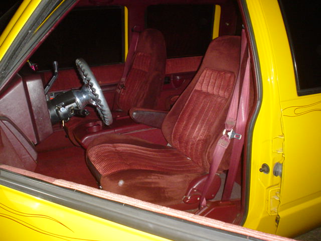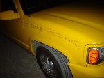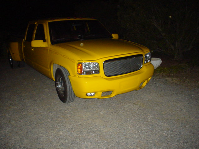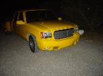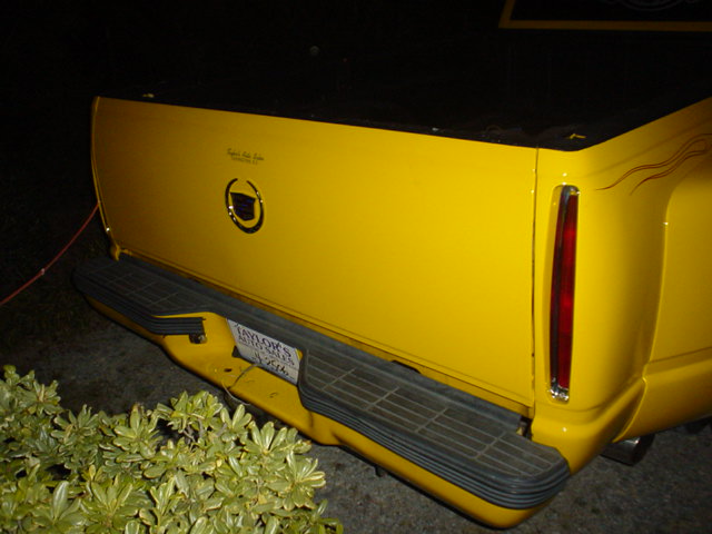 escalade frontend,cadillac tail lights, shaved tailgate handle, billet grille, clear corner lights, red pinstripe flames, custom yellow paint job