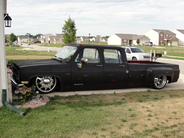 3" stockfloor bodydrop, slams re7's in front re8's in rear, airlift digital controller, nitro shocks, parallel 4-link, 1/2 inch valves, 4 viair 380c's,