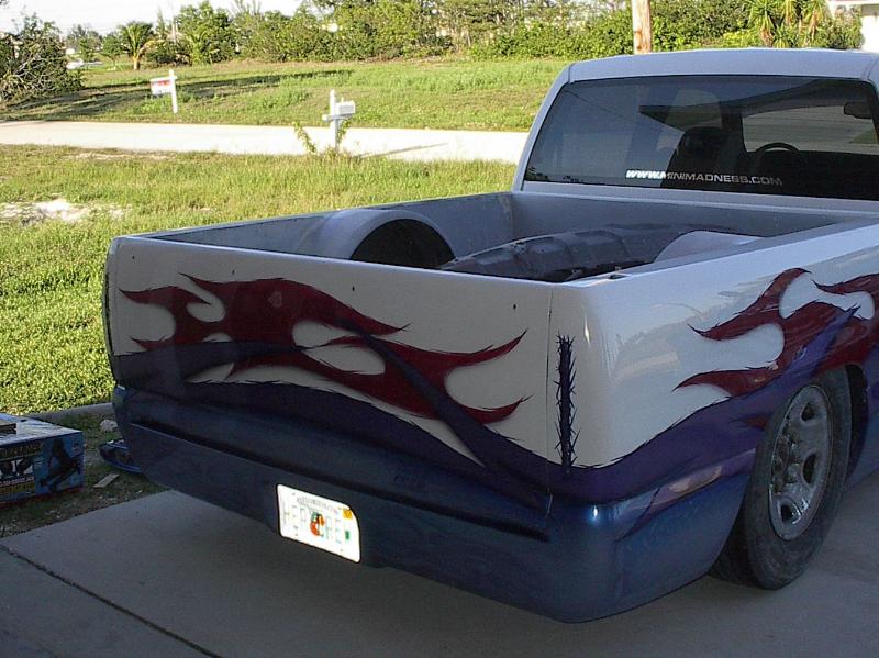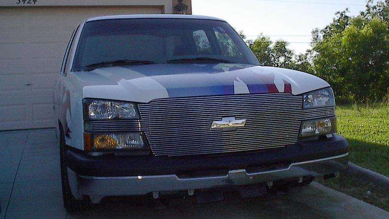 shaved like it's owner!...paint compliments of Fireball Graphics...12 layers of graphics, complete color change, graphics run through all 16 jambs and between the bed and cab, bed is completely covered in a diamond plate graphic with a kickass graphic on the hood...trenz billet grill, billet bow tie (well duh)
