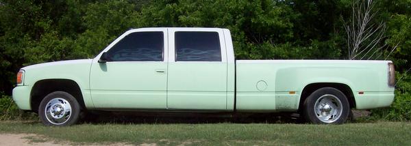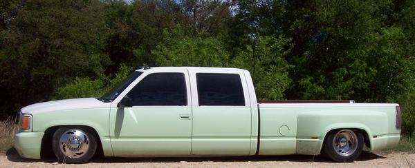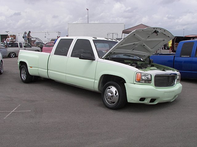shaved, primer, escalade clip, HIDs, billet grille (2) 12" LED tail lights, putco duramax ion chrome cab lights, 2 design flame tint, tubbed and halfway sheetmetaaled bed
