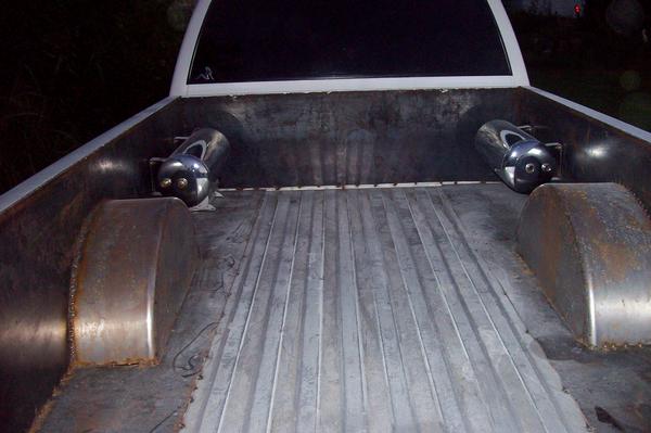 eclipse head unit, eclipse replacements powered by eclipse 400/4 amp, directed audio 2400d pushing 4 lanzar 1600 watt 12s in stained pine console running from dash to back of cab....subs suck ass