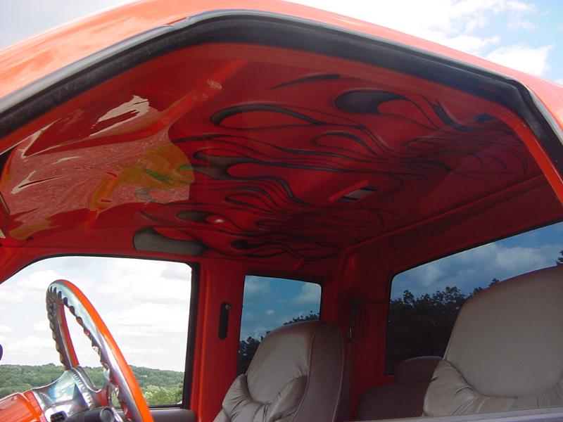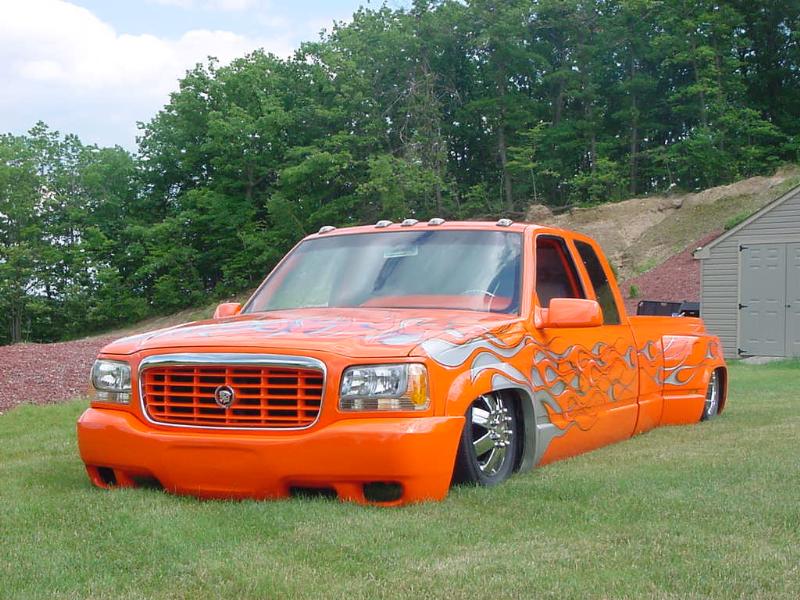 Custom PPG Orange, Double Set of Flames, Silver with a Silver Flake, Outlined in Black With an Orange Pearl. Mural on TailGate. 3 1/2 in. Stock Floor BodyDrop, Shaved Door Handles, 3rd Break Light, TailGate Handle, Gas Door, Antenna, Smoothed out bed, 99 Caddy Front End, Sir Michaels Roll Pan.