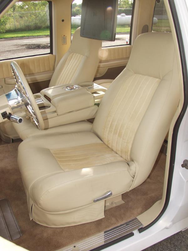 Shifter: Billet Specialties Light Buckskin Leather & Suede Dash, Seats, All Trim Pieces, and Steering Wheel Grip are covered in Leather. Headliner, Visors, inserts of seats, are covered in Suede and finished off with Coco Carpet.