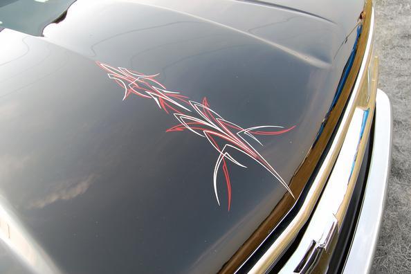 Some trim on the dash smoothed/shaved and line-xed. heat and air controls relocated to make room for three KP air gauges. New seat with shaved head rest, new carpet, and some small nik nak shit...
