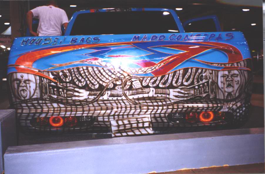 custom paint with graphics,shaved handles, shaved 3rd brake light, shaved antenna, shaved gas door, shaved tail lights and tailgate handle, molded in rear end, supra tail lights, frenched license plate, sliding rag, billet grille and bumper, cowl hood, smoothed bed,etc