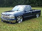 Indigo Blue Metallic, Tahoe chrome grille shell with billet inserts and billet bowtie, clear headlights and park lights, painted top bumper cap, Truckmaster designs front valance, Street Scene mirrors, Escalade door handles, Smoked factory taillights and 3rd brake light, Sir Micheals roll pan molded in, shaved tailgate with some old skool green and silver pinstriping by Perkins, HD hood. The bed floor has been raised 3 inches and has trailer fenders and notch cover all Rhino Lined black.
