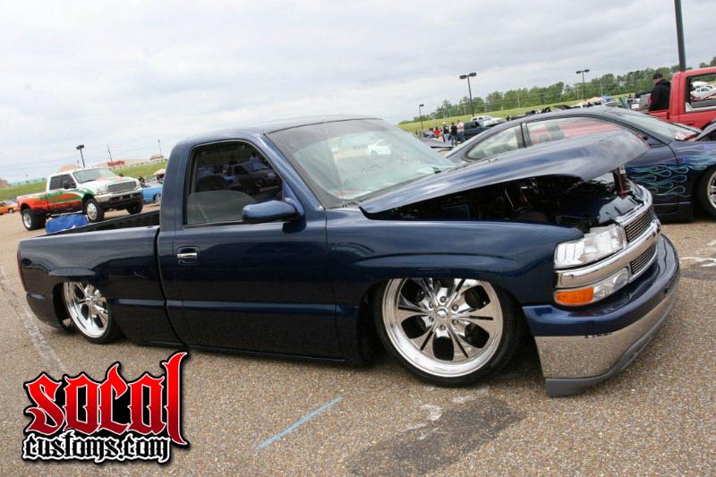Bagged and stock floor body dropped by ///Jeff Albritton of Diamond State Fabrications ///Mike Sigler, and myself. Custom 2-link in the rear with cross-link bar, Custom bag cup in the front with Belltech 2" drop spindles, 4-Slam Specialties bags, 2-Viar 480 Compressors, 2-5 gallon tanks, 8-3/8 SMC valves, plumbed with 1\2" line and Swagelock fittings. Tanks and compressors are mounted under the bed, and the valves are mounted under the rockers on each side. rearend narrowed 1.5", Devious Customs bodydropped fuel tank.