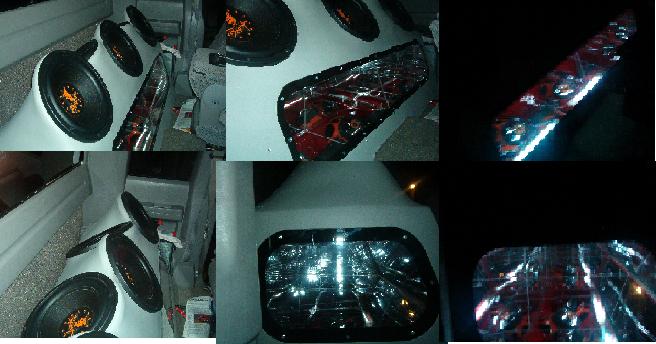 CD Player > 5 Cadence 12" subs > 1500w Cadence amp > Custom fiberglass/neon enclosure > Painted Box > Protected by Viper
