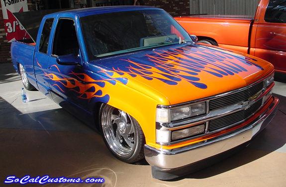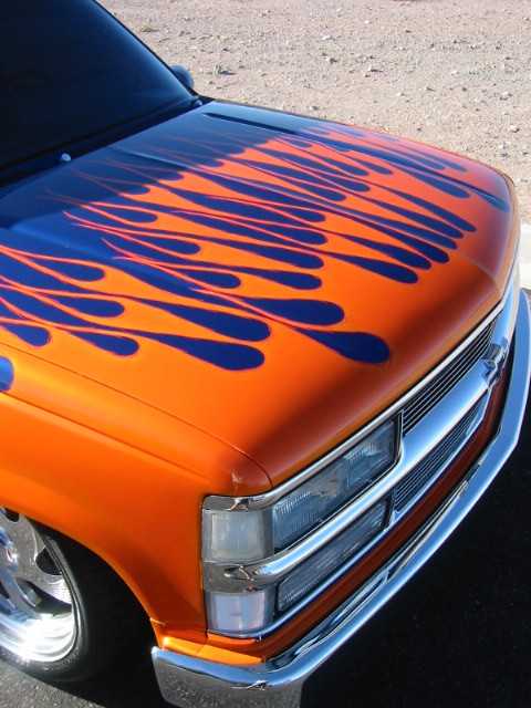 House of Kolor paint, blue base coat and orange flames sprayed by Mike at Unique R.V. and Autoworks. Shaved tailgate handle, third brake light, Sir Michaels rollpan, Street Scene mirrors