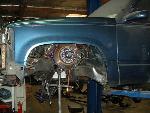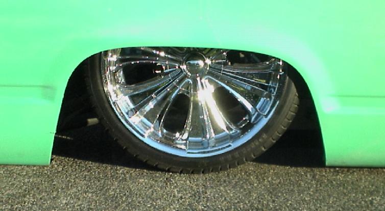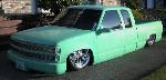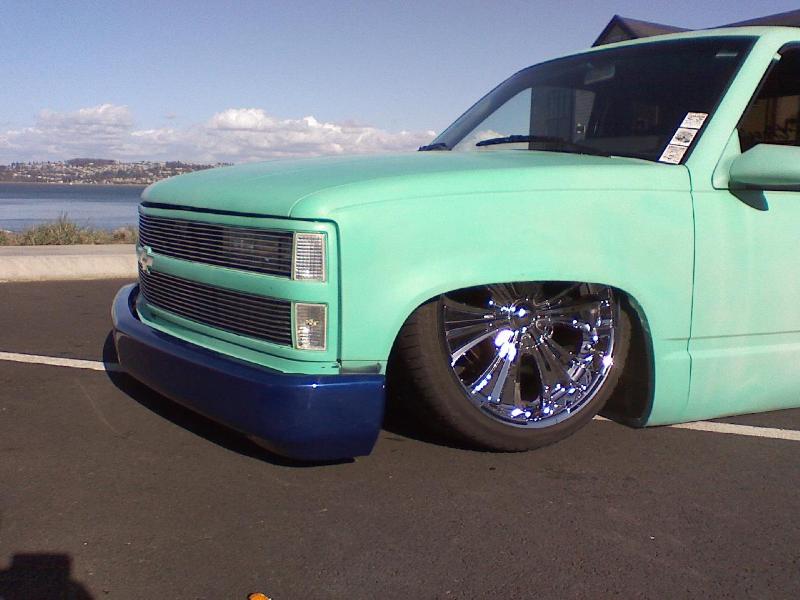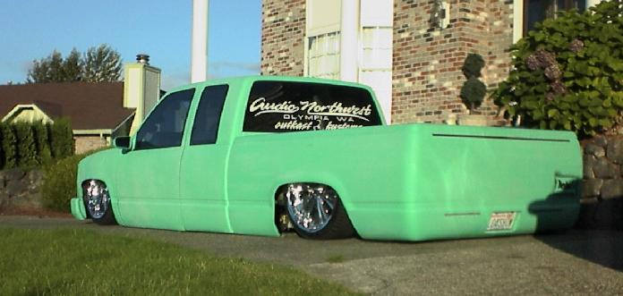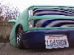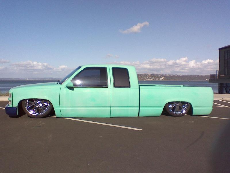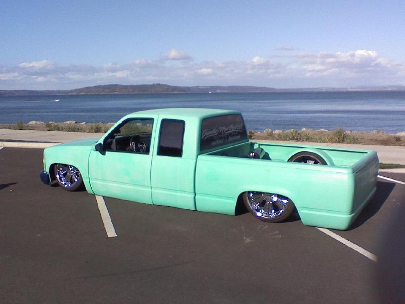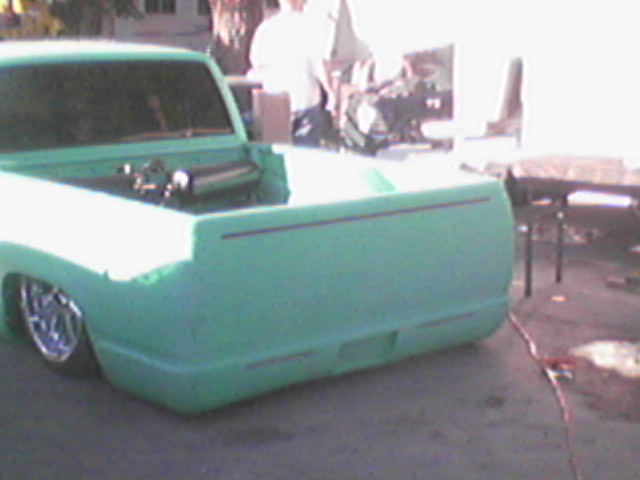 Cali-combo completely shaving taillights, tailgate and rollpan. also shaved gastank door, rocker pannels, stake-post holes, doorhandles, and antenna, frenched license plate box 58" flush mount LED third brake light + LED brake, blinker, and backup light combo down low, phantom billet grill, and smooth steel bumper with frenched license plate box. Smothered in green primer