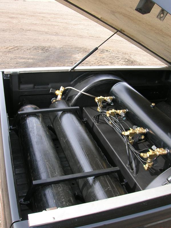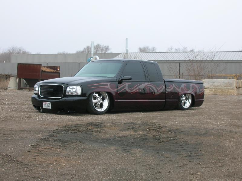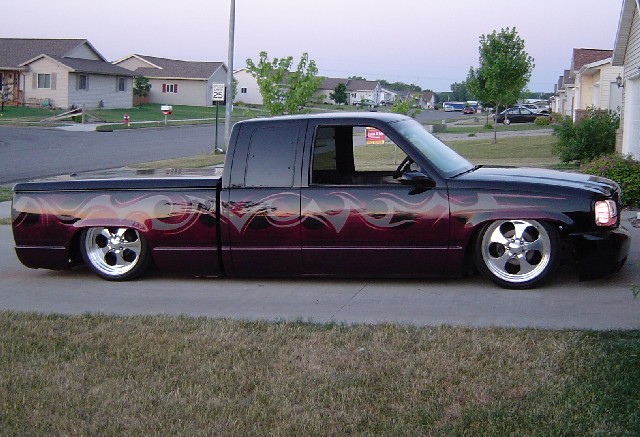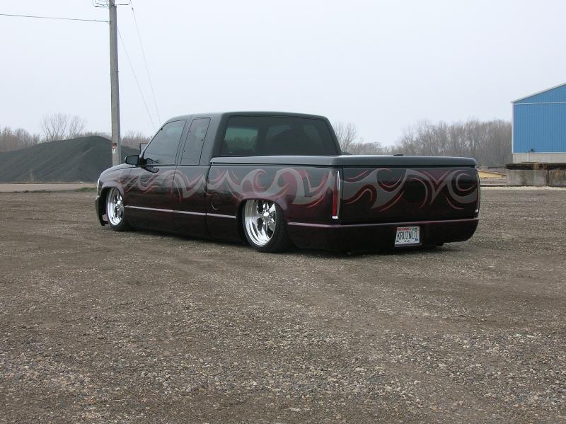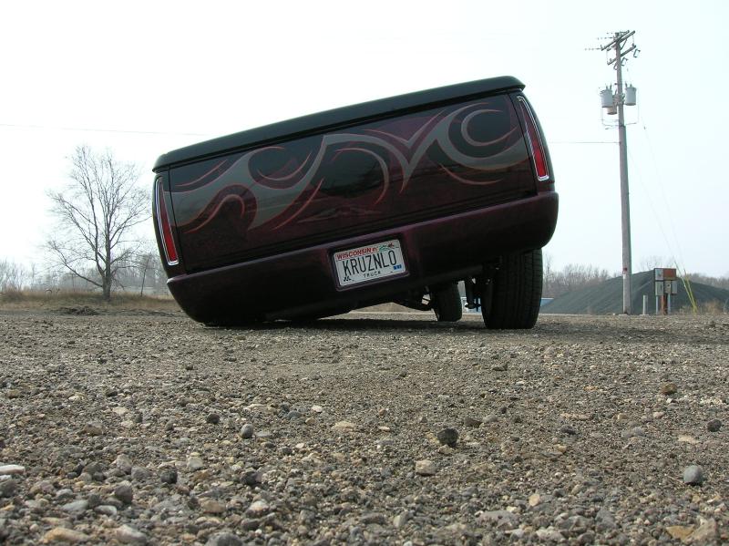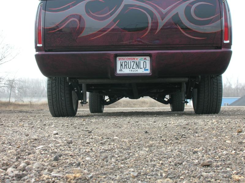 Front; Slam RE-7s sectioned suicide cups, notched and clearanced for tie rods, modded LCA's, Rear; Custom 4 link, custom canti, custom watts all by me! RE-7s, Dual 300cu Nitrogen tanks, Smith regulator, 12 gallon holding tank, (4) 1/2" ASCO valves (fills), (4) 3/8" SMC (dumps) with 1/4" line plumbed out of bed. (3) KP dual needle gauges in triple pillar pod, switches in dash, AVS 7 switch controller. rear disk brakes. A serious 12" of full lift from laying frame front and back. modding the rear for better side to side! does pretty good now