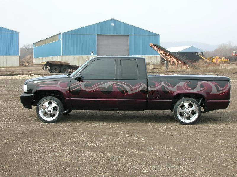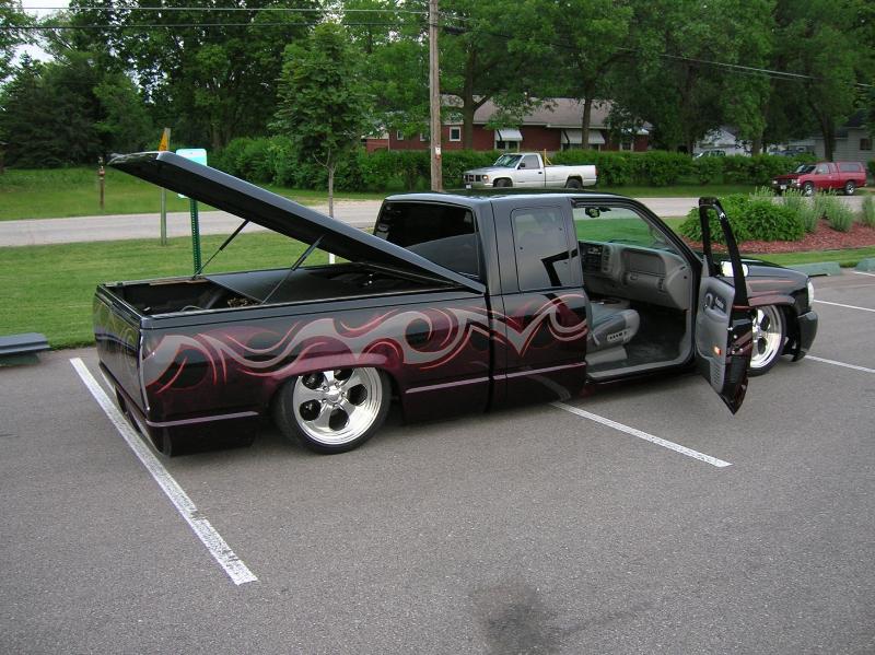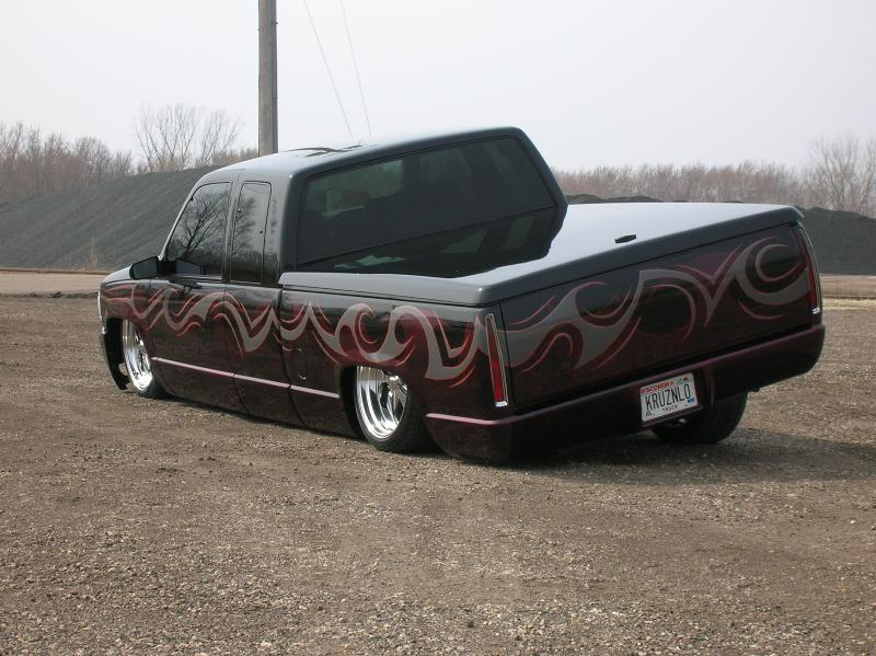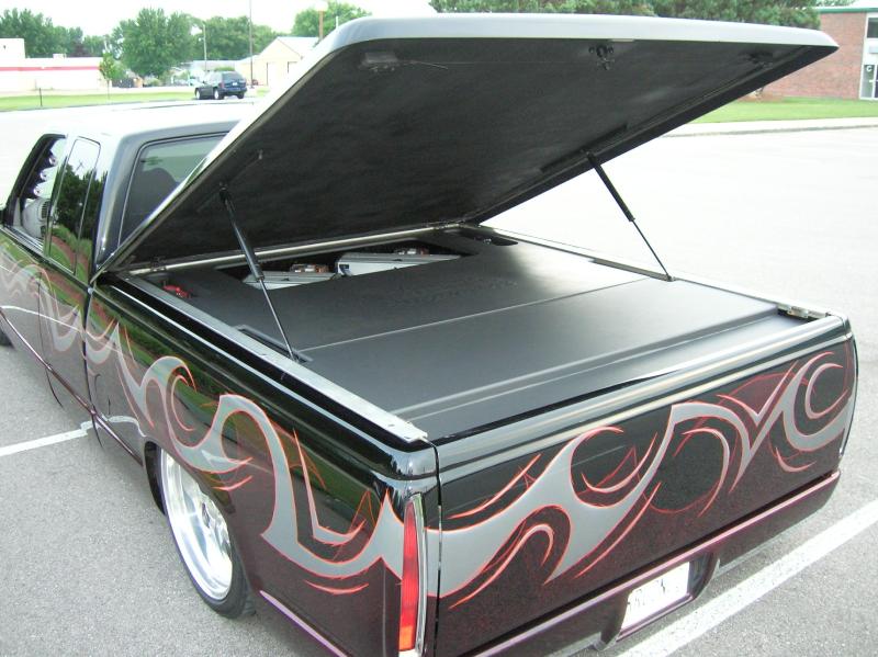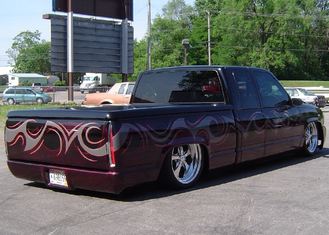 Denali oem clip, Shaved taillghts, frenched 96 deville tails, (grant customs fillers and buckets), Molded "Custom Classic" roll pan, Raider Lorider tonneau cover, Shaved gate handle, Shaved door handles, Shaved Cab Seams, Shaved 3rd Brake Light, All New PPG Glass! Tint, Street scene LED signal mirrors, Smoothed factory wiper cowl, paint carried into jams.. etc etc