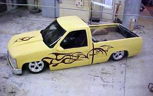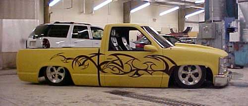 billet bumper and grille, clear corners, cowl hood, shaved ass end, shaved stake pockets,shaved door handles, shaved third brake light, shaved antenna, shaved gas door,caddy tail lights and custom molded bed,oh yeah its body dropped 3"