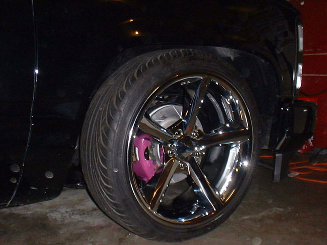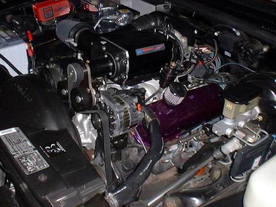 ENGINE--stock Chevy Mark IV 454 4 bolt main with a Whipple Supercharger running 8lbs. of boost. Edelbrock performer aluminum intake manifold, Comp Cams magnum 1.72 roller tip rockers, Comp Cams magnum push rods/guide plates. Edelbrock aluminum water pump. K/N air filter. translucent purple powder coated TRW valve covers w/K and N breather. Edelbrock T.E.S. 409 stainless steel headers. FlowMaster 2 chamber 3"exhaust. 180 degree thermostat.