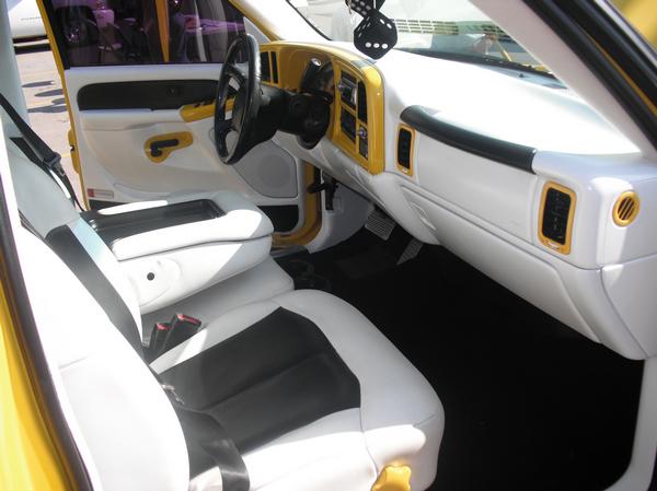 white and yellow dash and door panels,white nd black seats, black carpet and whit head liner