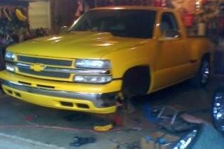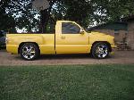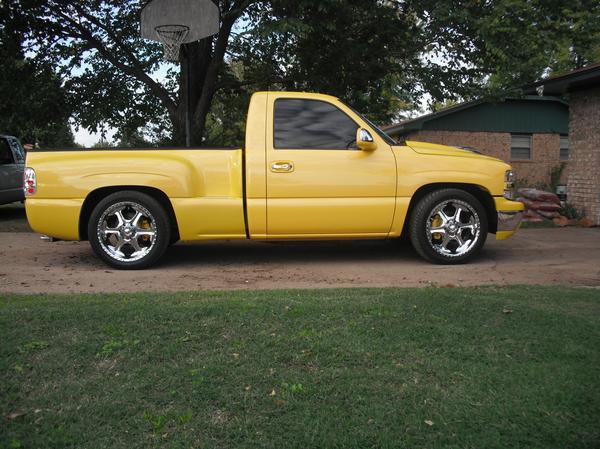 yellow with a red perol, roll pan, shaved tailgate, custom taillights, bed cover, billet flame door handles, 5% tint, cowl hood, billet grill, halo head lights, painted air dam yellow bow tie and 20" rims