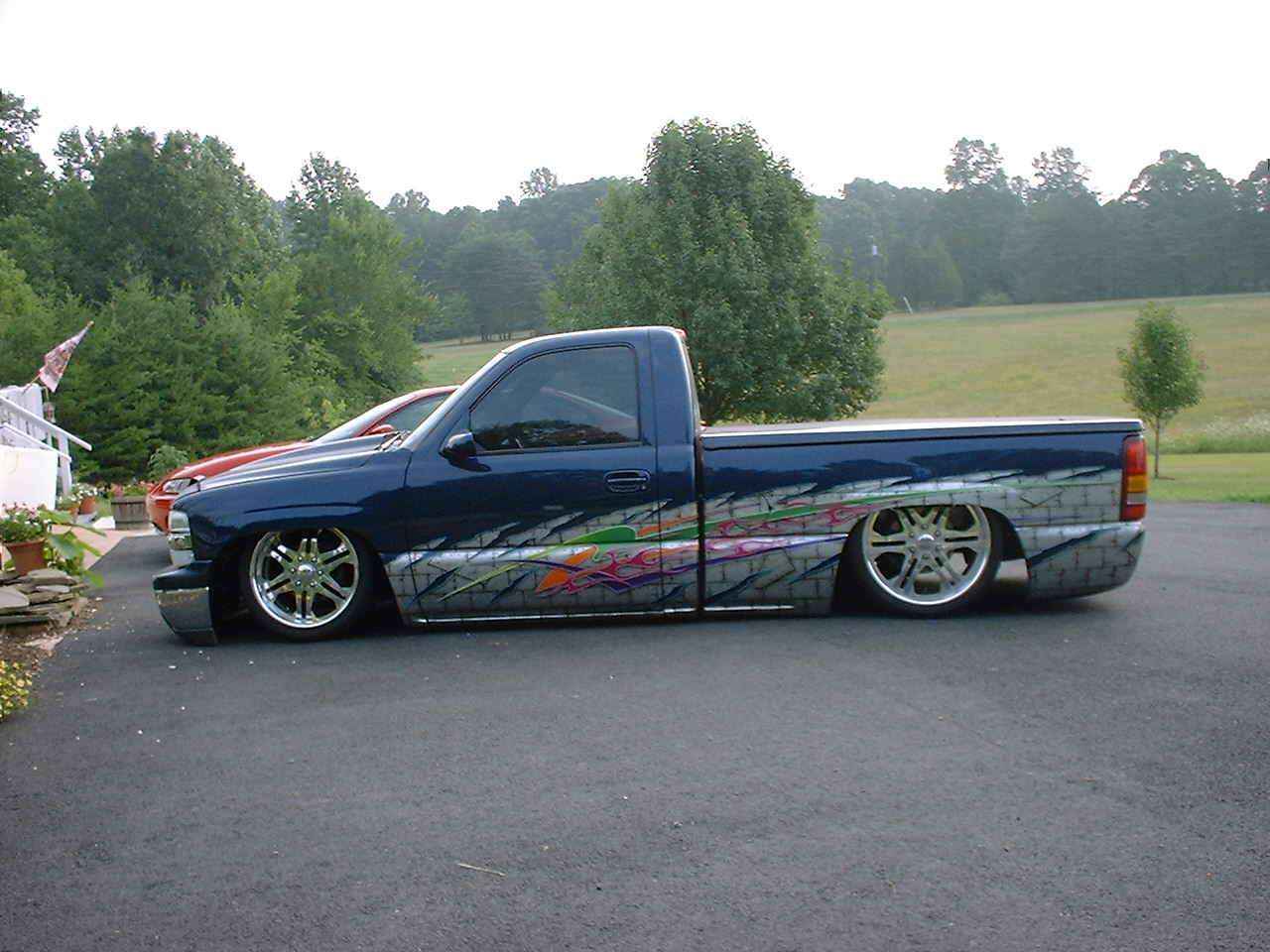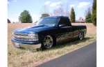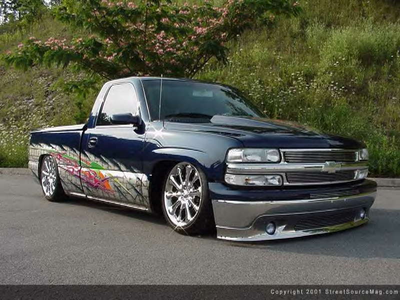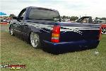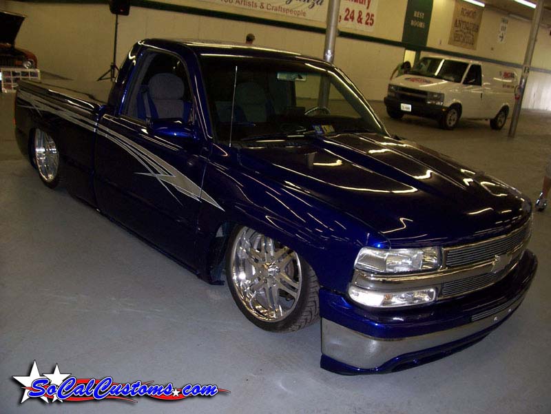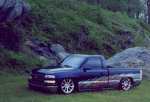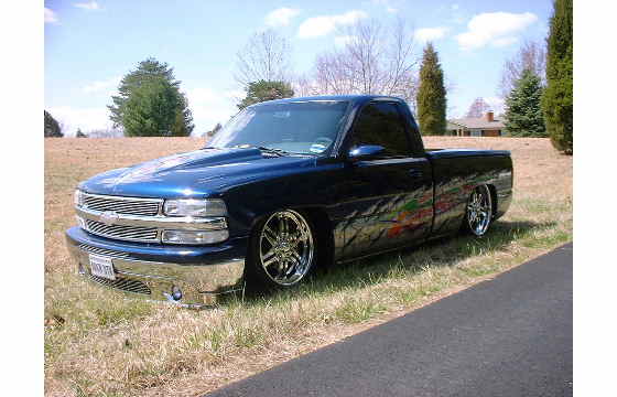 Indigo blue with House of Kolor graphics. Suburban front grill shell with billet insert, clears all around, shaved t-gate handle, sir micheals steel roll pan, Gaylords tonneau, bumper color matched with billet insert with chrome valance with billet insert