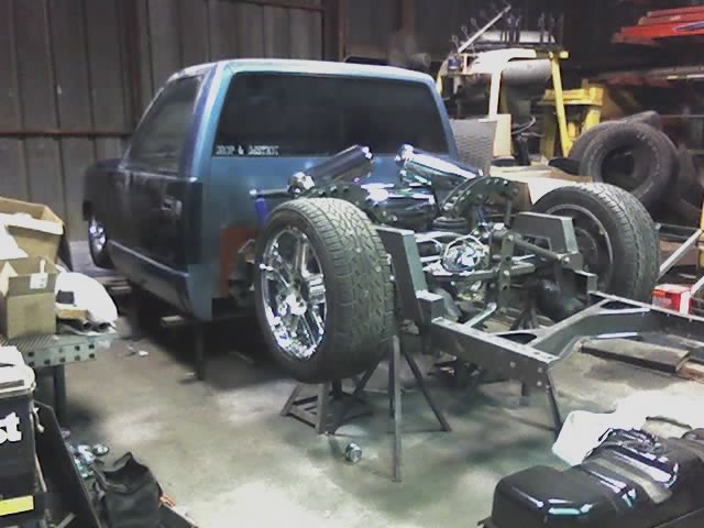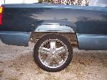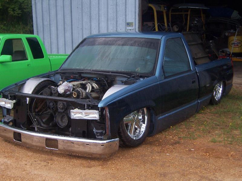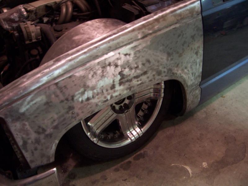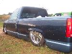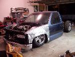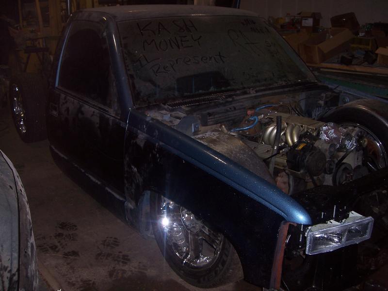Some ugly old paint that keeps getting more beat up everyday. Sectioned rockers one inch, custom wheel tubs under the hood and in the bed, stock floor bed(well kind of), Bare metal, soon? 99 Deville tail lights, one suicide door (so far).