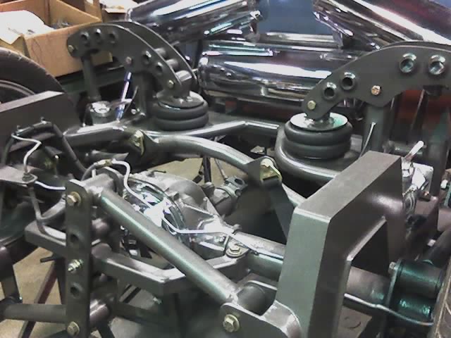 Cantilever rear setup over a raised stock tank, SD parallel 4-link 35" bars, 10" notch, gen 2 bridge, Airlift bags, 2 Viair 380's, 2 SMC watertraps, 8 SMC half-inch valves, 5 gallon 9 port chrome tank, two chrome 3 gallon's, ten switches, and a custom built watt's link (good for over a foot of lift). Monroe shocks all the way around. 20 inch Crow limit straps to limit lift to 18 inches.