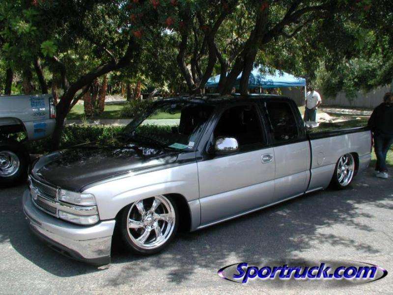 2 tone new 2003 Silverado Charcol Gray upper and stock silver. no moldings and 2003 chevy tailights, color matched Snug Top and carpet kit for the bed, Escalade rear handles(no key holes), roll pan and smooth wiper cowl