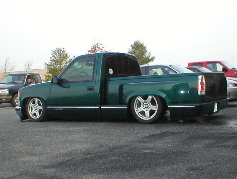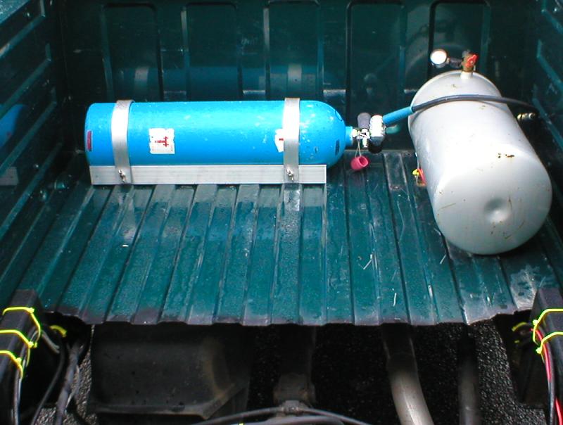 2" Belltech spindles, 1/2 ported Slam Specialties RS72 bags front & rear, custom 2-link rear with panhard rod and notch thru bed to lay frame. 80cf SCUBA tank and 5 Gallon air tank with Firestone compressor for backup.