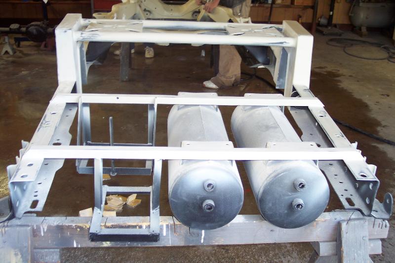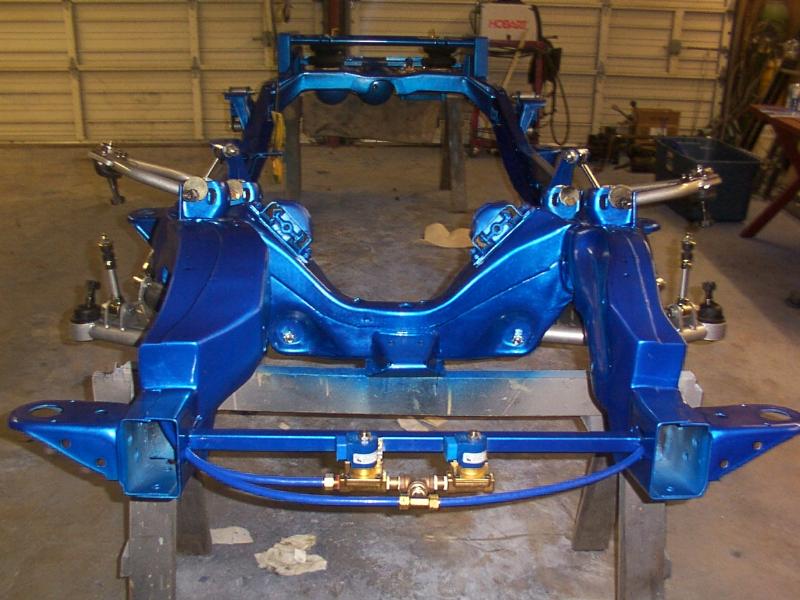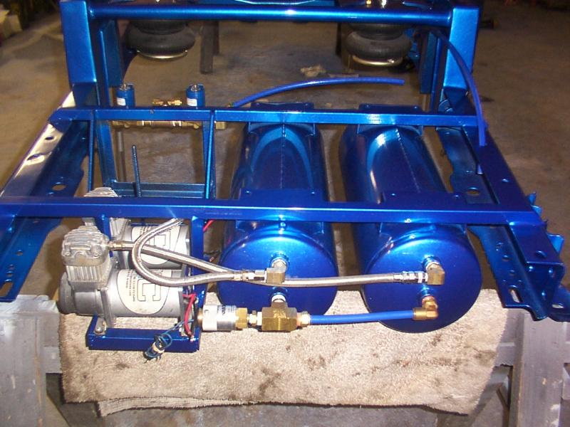 All 1/2" airline, GC extreme valves, and connitec bags, Fully painted and smoothed frame, powder-coated upper and lower control armes and parallel four-link, chrome shocks all corners, two Viar 325 compressors and two 5 gallon tanks, 2" drop spindles