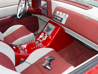 All tweed with a billet dash kit, ac vents, steering wheel, shifter, a custom made fiberglass console with a 6.5" TV, playstation and VCR made in. They are surrounded by Honda Civic seats