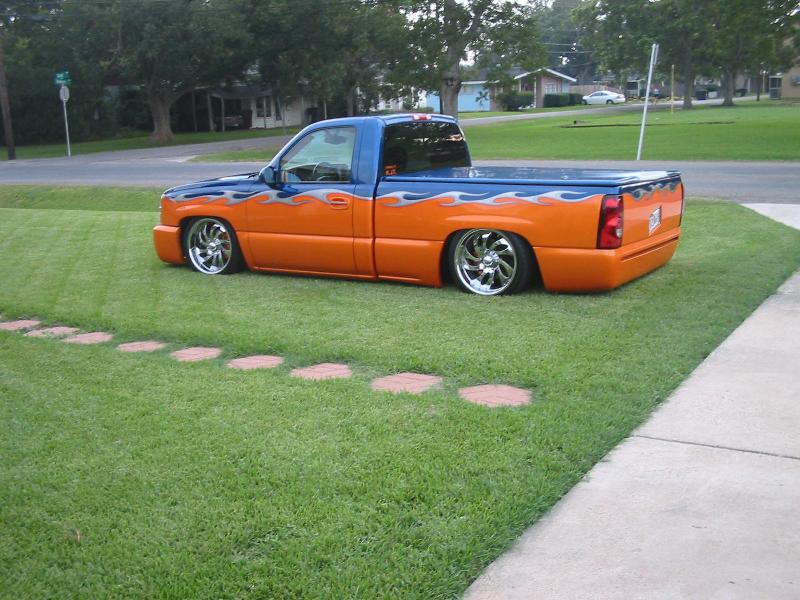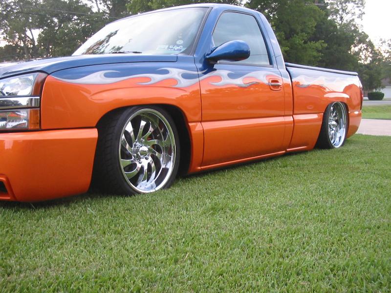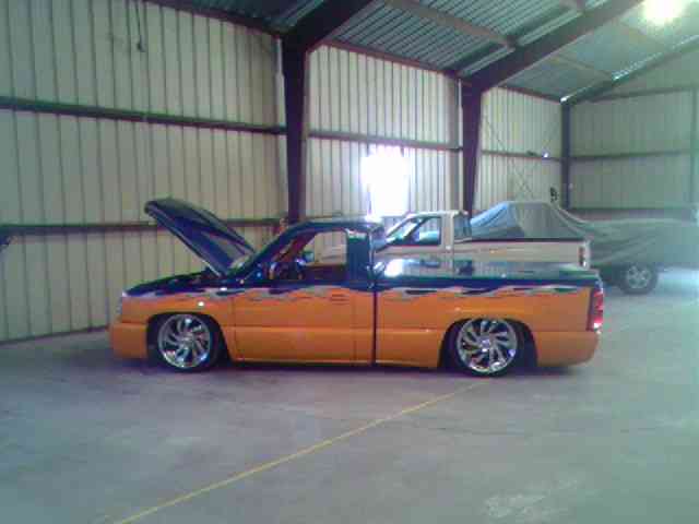shaved emblems,shaved tailgate with license plate box in it,shaved fuel door,SS bumper cover,fiberglass bed cover,billet intenna,shaved roll pan,graphics HOK sunset pearl,orion silver,and arrival blue