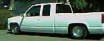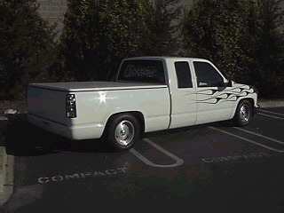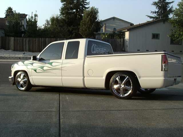 frost white paint with candy green marbled flames with purple pinstripes atop a reflections cowl induction hood. shaved handles, third brake light, tailgate handle and stake pockets. Got rid of euro headlights, stock ones back in and euro's out back came apart. gotta glue back together. hyper white bulbs.
