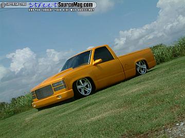 shaved handles, shaved antenna, shaved tailights, shaved 3rd brake light, shaved tailgate handle, teardrop bumper, diamond headlights, gmc full phantom grill, cowl induction hood, 12'' led in place of 3rd brake, tribal light rollpan, lisence plate box in tailgate, custom HOK Sunrise pearl paint with pearl flames and color matched bedliner