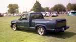 Emerald Metallic green with silver and white flame graphics, all trim and mouldings shaved and filled, bumpers and taillight covers match painted, Phantom grill with custom license bracket, clear corners, aluminum bowtie and various accessories, flush fit tonneau cover, street scene mirrors, spray in liner (just tryin to turn some heads)