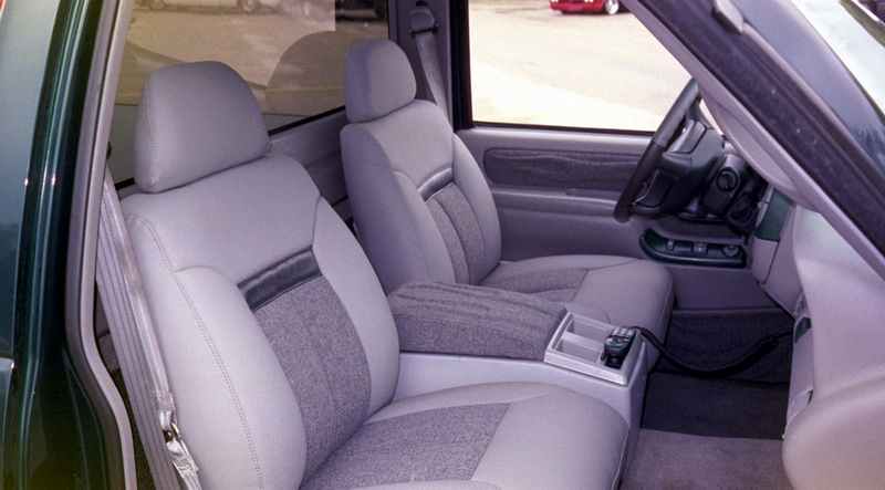 two tone gray leather on tweed with flame design on doors and headliner, silver lizard skin trim, hand made gauges with AutoMeter internals, stock trim pieces match-painted to exterior, various billet trim pieces, Suncatcher light-sensitive window tint (nice and comfy on the everyday commute)