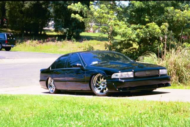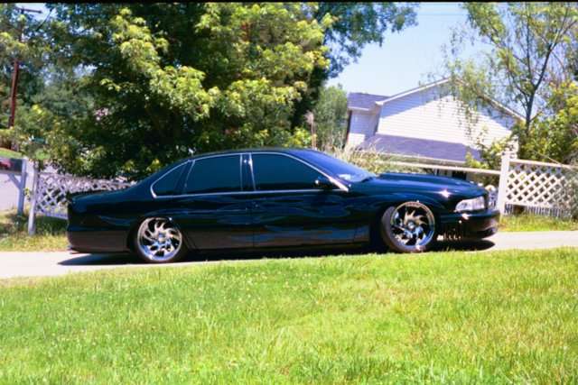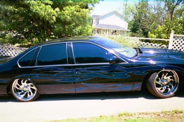 Blue Tribal Flames, House of Kolor Ice pearl, Marblizer, tiny skulls in flames, Shaved Taillights! Shaved antenna, 20 inch KMC Helions, diamond clear corners