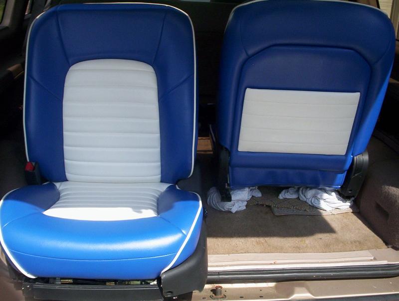 100 sq. of fat mat sound deadner laid, heat shield laid, black cadrpet, two-tone blue and white viynl interior w/ buckets added, custom headliner w/ 3-D Flamed design by Ken aka BigRigz wrapped in royal blue, custom rear dash pad with chevy imblem laid in also wrapped in royal blue, sunvisor wrapped in royal blue and outlined in white to match headliner, custom console wrapped in blue vinyl to match seat which has: headunit, 3-guage inserts, cup holders and compartment with flamed lid to match headliner. trunk is about to be boxed in and covered with electric blue capet. (If you like the seats contact me and i'll hook you up with the lady that did it. She does damn fine work for a really reasonable price.)