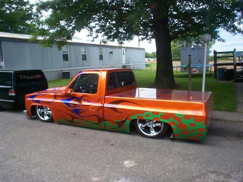 Shaved antenna, roof rack holes, and squirters. Updated the front end to 99 Jimmy healights, and 99 Envoy air dam/bumper cover and grill with Trenz Billet inserts. Reflexxion's Steel Cowlinduction hood. Street Scenes Power mirrors. Shaved door handles, rear wiper and lock, roll pan and S-10 rear quarters molded in. If you look in the pics you can see where we grafted the factory pan and the Alter Images pan together!! Moved gas tank to the rear, with a 20 gal. out of a 2dr blazer!!