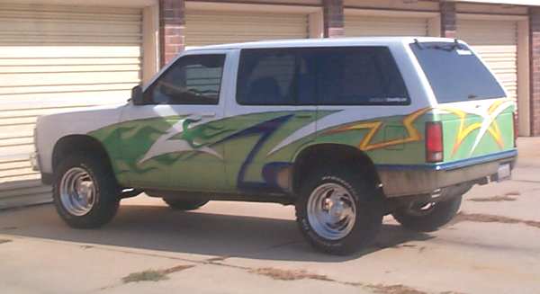 Graphics, shaved antenna, third brake light, roof rack, spare tire carrier, molded roll pan