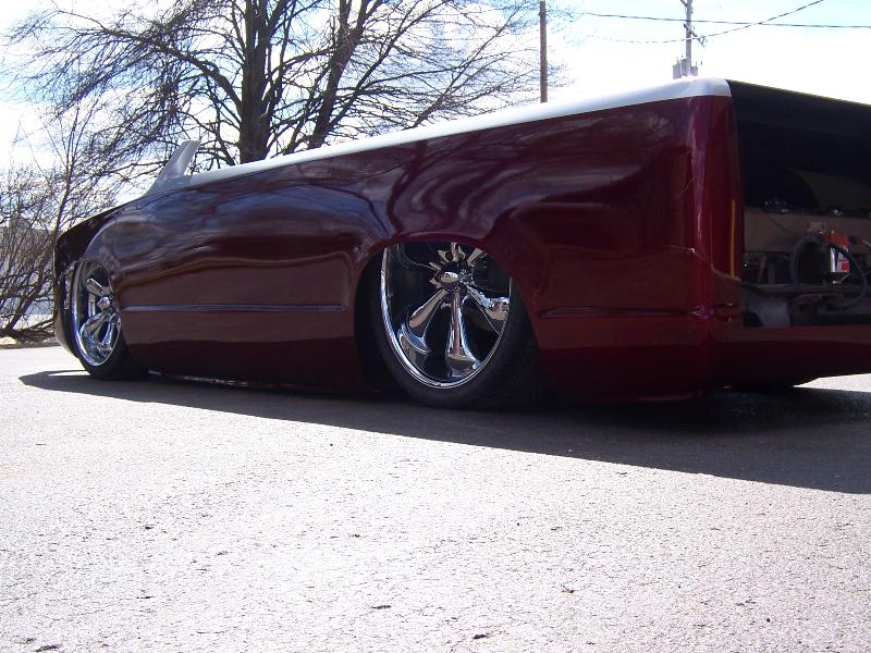 Pete and Jake's triangulated 4 link rear with firestone 2600# bags. Tubular front A-arms with 2500# and Bell Tech 2" drop spindles. Frame is back halfed with air tanks built into frame rails, smoothed and painted.