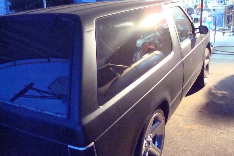 SHAVED:door handles,emblems,roof rack,and antenna. ADDED:full primer,rollpan,billet grille,license plate box, and 15%tint.