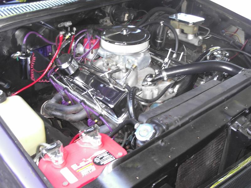 built chevy 350, TH350 trans, edelbrock intake, demon carb, hedman headers, mallory ignition, taylor 8mm plug wires, accel shorty plugs, chrome 100amp alternator, lots of other chrome stuff.