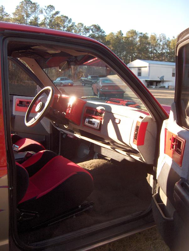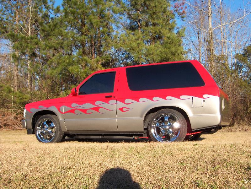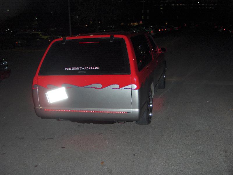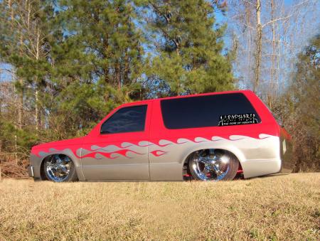 Shaved tailgate,tail lights, roof line and rack, steel cowl hood,upgraded front end, viper red flames with pewter on bottom and purple pinstripe.