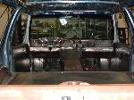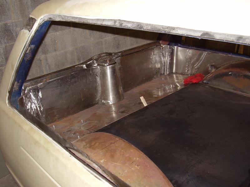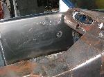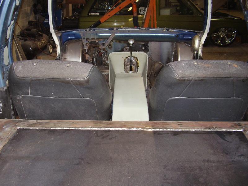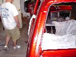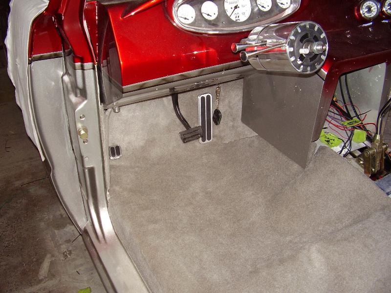 Billet Specialties steering column. Full billet Billet Specialties Vintec steering wheel. Custom sheetmetal dash and console. Lokar cluster, Moon Eyes Gauges. Easy Street Air Gauges. Metal door panels with Lokar door handles. Lokar shifter. Lokar Eliminator Floor Mount Gas Pedal, with matching Lokar Brake Pedal Pad, and Lokar Dimmer Switch Cover. Sheet metal interior done by sean@ seriously insane auto concepts. All paint work done by Donny Schreiner of MaxxMuscle Custom Cycle Painting. Julianos airplane style lap belts. Seats and headliner covered by David Corn at Pro Stitch Custom Interiors. Seats covered in red and grey suede with a dark grey strip in the middle to match the paint scheme. Silver carpet also done by David Corn.
