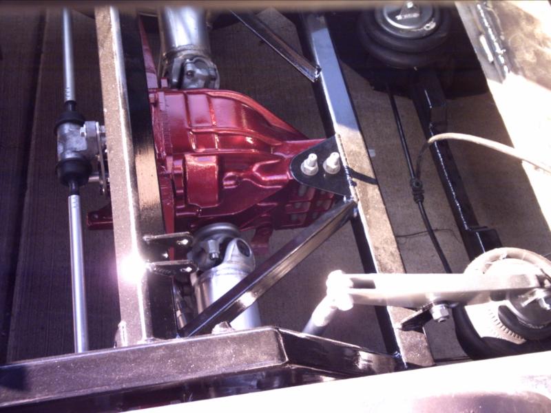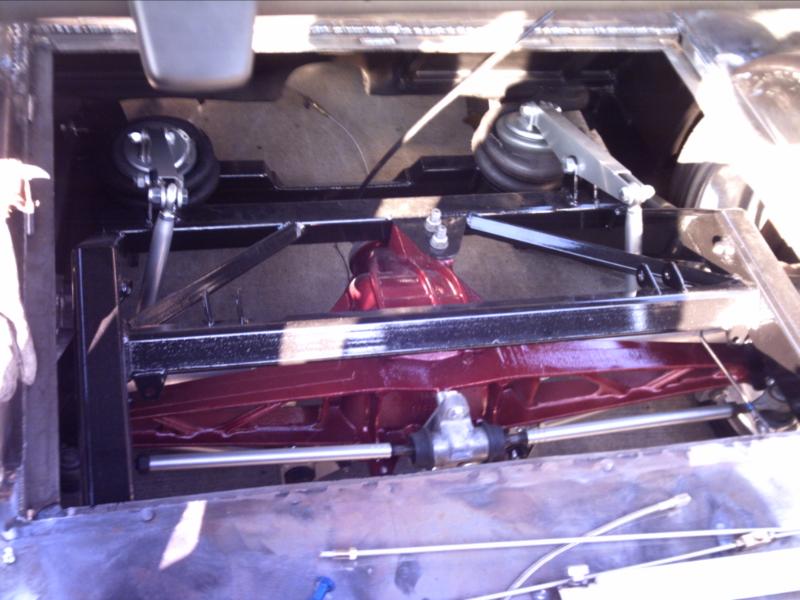 4 1/2" bodydrop. Barnyard upper and lower control arms painted silver. 2500's up front with spindles (All suspension and brakes painted to match).Back-half rear frame with 1990 corvette irs painted candy red(narowed 9"). Cantilever with 2600 lb bags. work done by sean @ seriously insane auto concepts. All paint work done by Donny Schreiner at MaxxMuscle Custom Cycle Painting.