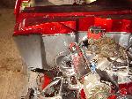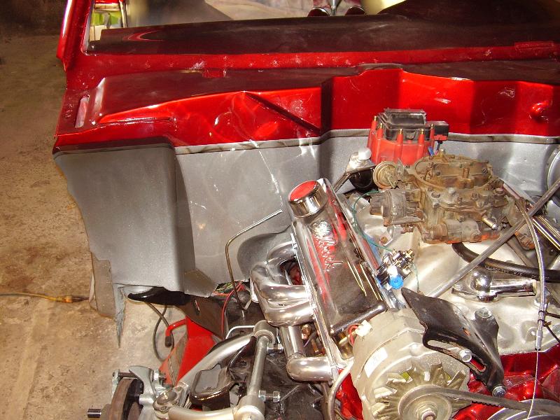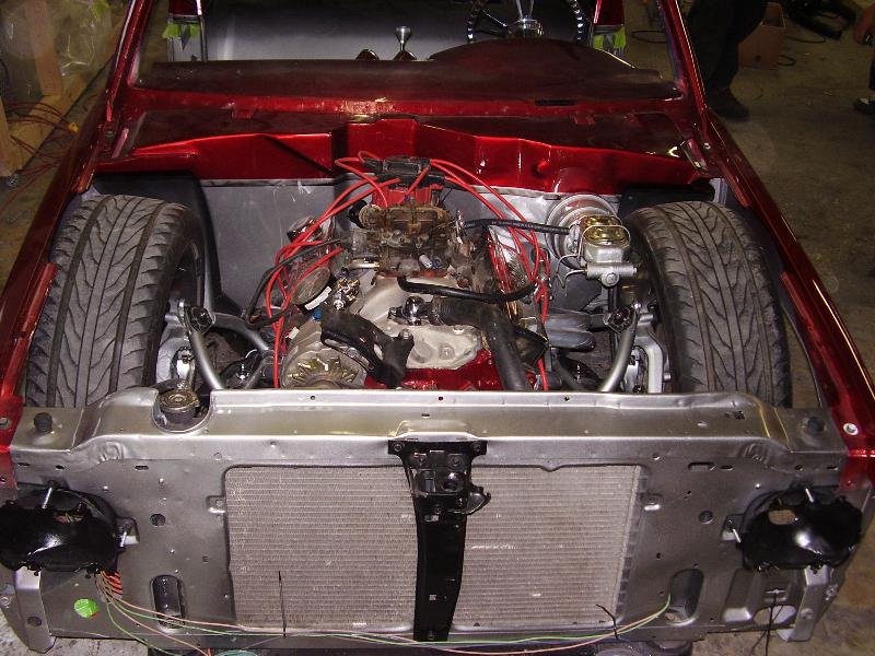 Crate 350 with 700r4 tranny. lokar shifter. some dress up stuff. Pete Jackson gear drive. Holley fuel pressure regulator. Edelbrock Aluminum Intake. Ceramic Coated Headers, 2 1/2" exhaust with Flowmasters. Engine block and transmssion painted candy red. Billet valve covers painted silver and candy red to match paint scheme. American Autowire wiring harness. Lokar Throttle Cable, Kickdown Cable, Engine Dipstick and Throttle Cable Mounting Bracket w/Return Springs. Lokar Speedometer Cable. MBM Master, and MBM 7" Dual Diaphram Booster. All stainless brake line. Billet Specialties Overflow Tank. Billet Wire Looms. All paint work done by Donny Schreiner at MaxxMuscle Custom Cycle Painting.