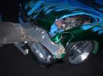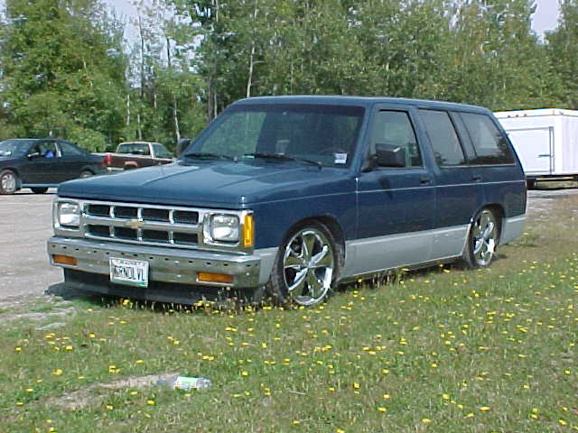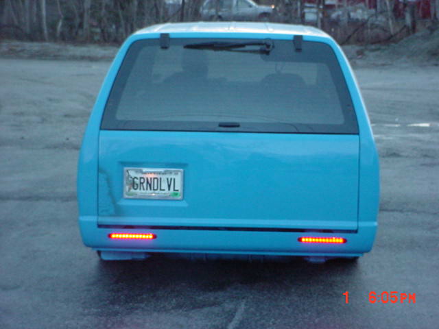 shaved tail lights l.e.d. lights in smooth f.b.i. roll pan. licence plate box frenched into tail gate . shaved roof rack, door handles,body line....... fresh ford grabber blue paint with HOK organic green candy flames and skulls....
