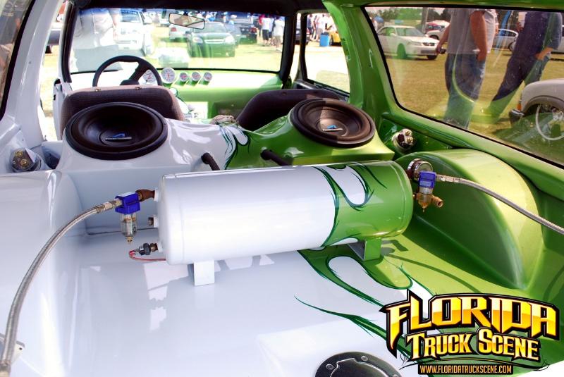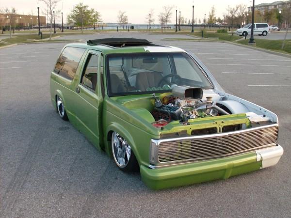 frenched in tag, intennas, civic door handels, dodge rampage tail lights, new school fender flares, suicide doors and hood, rag top, 73 fulsize bumper shorten and molded,etc.