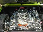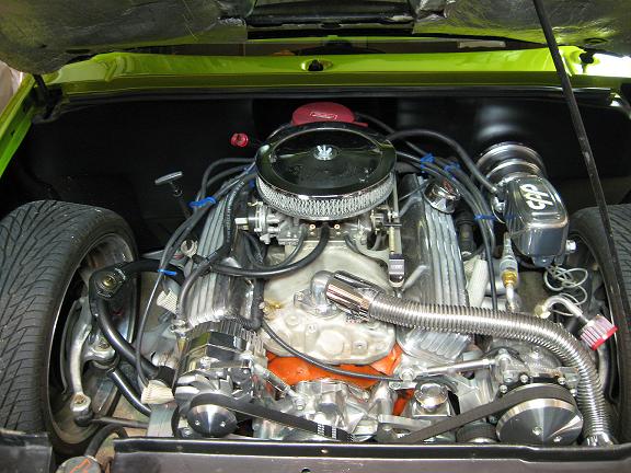 chevy 350 v8, edlebrock performer 600 cfm carb and edlebrock performer intake, lunati cam, headman headers,march billet engine puleys, hig output alt, polihed aluminum water pump, be cool rad, mallory hei, stage 2 bowtie overdrives 700r4 trans, 2600 stall converter