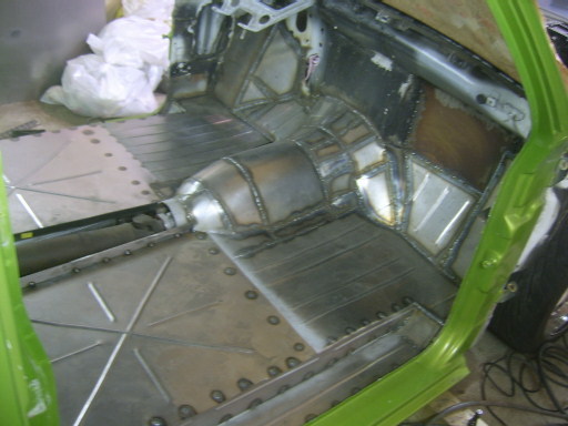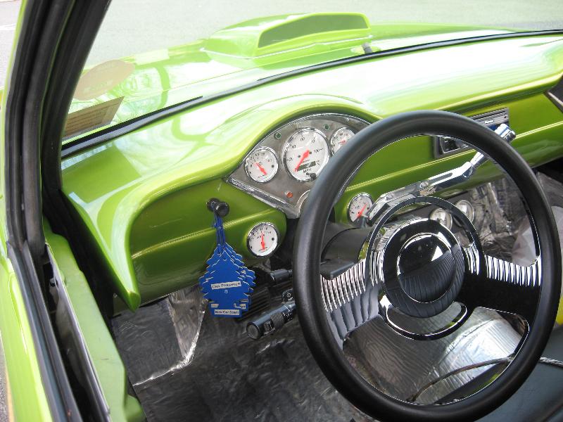 55 chevy dash, bench seat with tuck and roll, chrome steering wheel, autometer artic white guages, complete from front to back bead rolled floor hand built, for a traditional body drop, with only losing 3 inches of head room